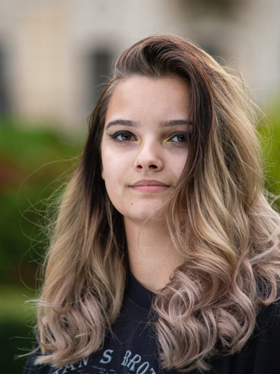 Lela wearing a black and white dress